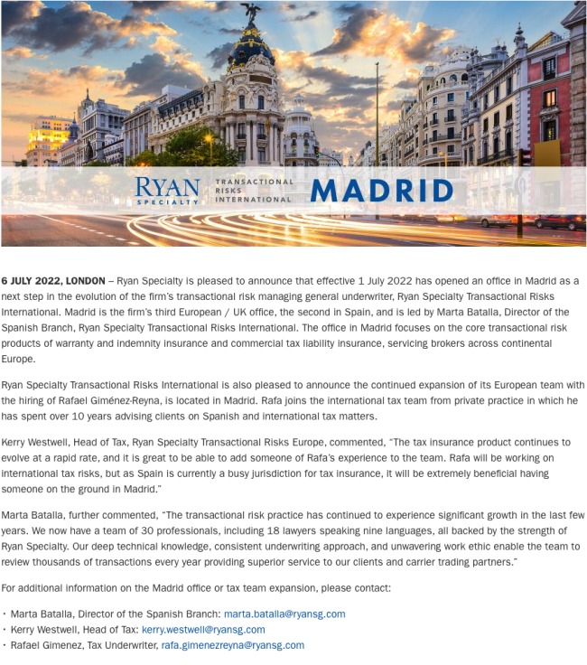 Ryan Specialty Expands Presence in Europe with Madrid Office