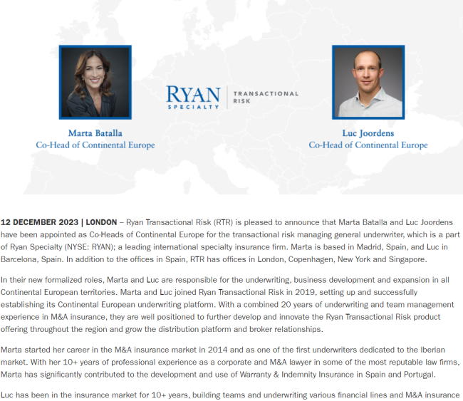 Marta Batalla and Luc Joordens Appointed Co-Heads of Continental Europe for Ryan Transactional Risk NewsBy Daniel BosseDecember 12, 2023