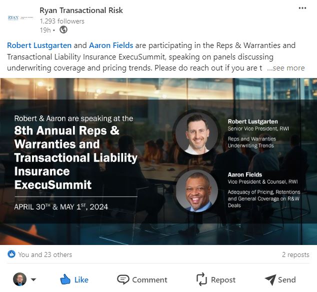 Robert Lustgarten and Aaron Fields are participating in the Reps & Warranties and Transactional Liability Insurance ExecuSummit LinkedInBy Daniel BosseMay 2, 2024
