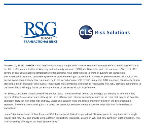 RSG Transactional Risks Europe and CLS Risk Solutions Offer New Product for Real Estate Asset Purchasers NewsBy Ryan Transactional RiskOctober 10, 2019